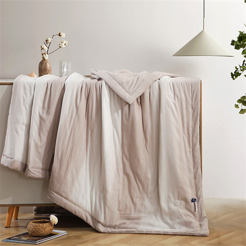 色織面料,是將紗線先染色后進行織造處理,織物色牢度更高,同時在織造過程中多道水洗過濾印染雜質,布料更環保健康;用于被類面料織造,優雅漸變色系,形成類似竹節樣的紋理效果,經過特別處理后使織物表面色調、光澤更加柔和;填充100克每平方整張定型羽絲棉,更顯被形勻稱,被周采用圓角機包邊立體工整,羽絲質地易清洗打理,是一款適合貼身覆蓋的綠色環保家居床品。