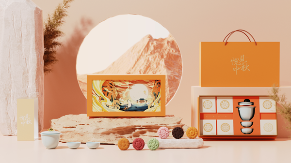 以“我欲乘風歸去 又恐瓊樓玉宇”迎合“千里共嬋娟”中秋美景,詮釋團圓之意。滿山桂花飄絮,香滿天下,有著“吉祥”的象征,孔明燈寄托相思,與心愛之人泛舟歸來,體現(xiàn)心中之“悅”,“悅”又同月,畫面以月為中心,更加完整體現(xiàn)出中秋之美。