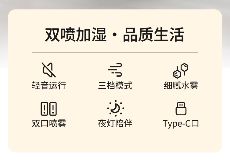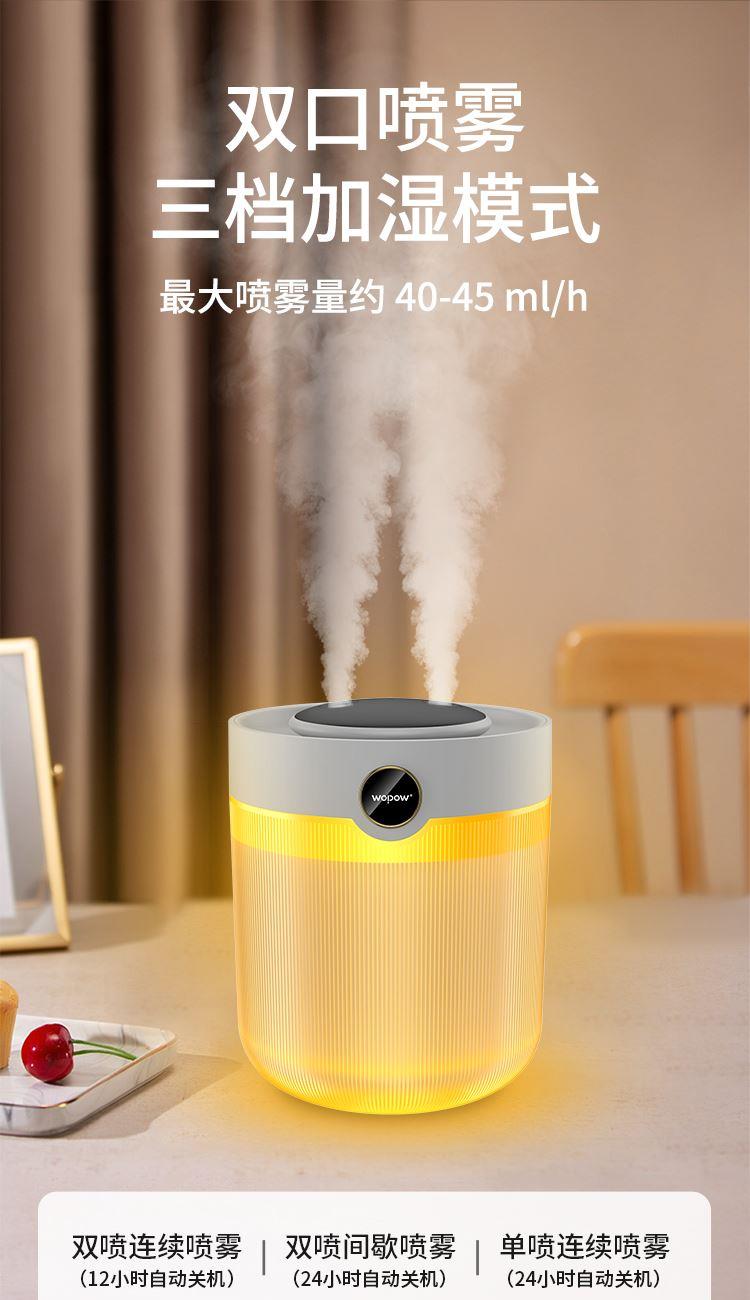 容量:2L 產品尺寸:153*153*177mm 包裝尺寸:165*165*202.5mm 產品重量:165g 噴霧時間:單噴:50小時,雙噴:25小時 雙噴霧連續噴霧12小時自動關機,單噴霧連續噴霧24小時自動關機 噴霧量:約40-45ML/H 顏色:白 材質:PP/PC/電子元件 七彩氛圍燈光,雙噴頭 靜音加濕,納米細霧 輕音運行,一鍵操作 TYPE-C輸入,2L大容量 三檔加濕,便攜上加水,四季通用