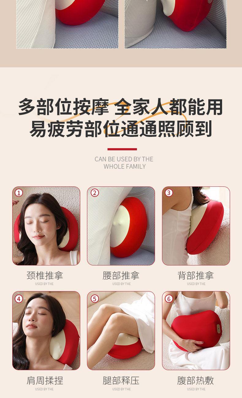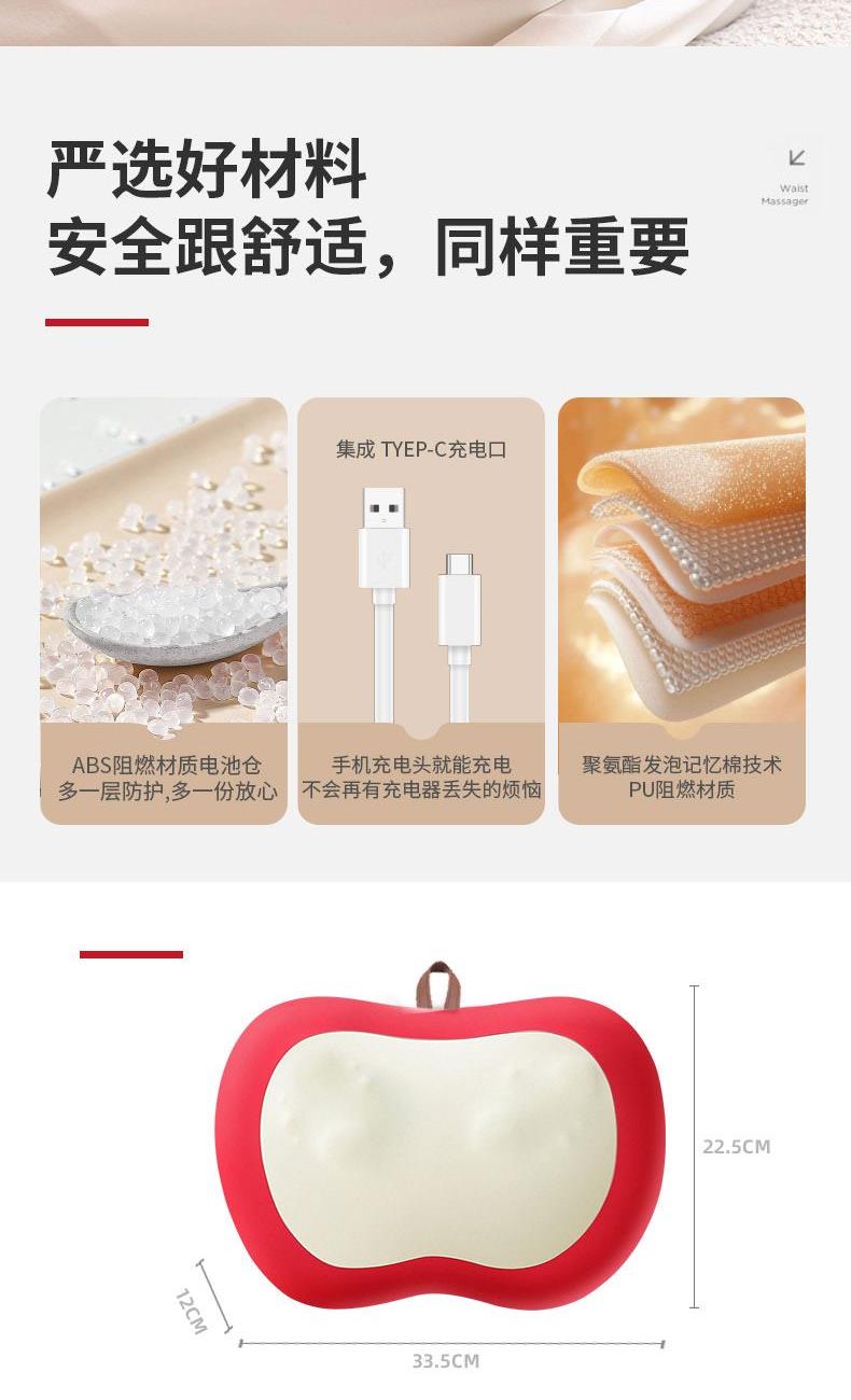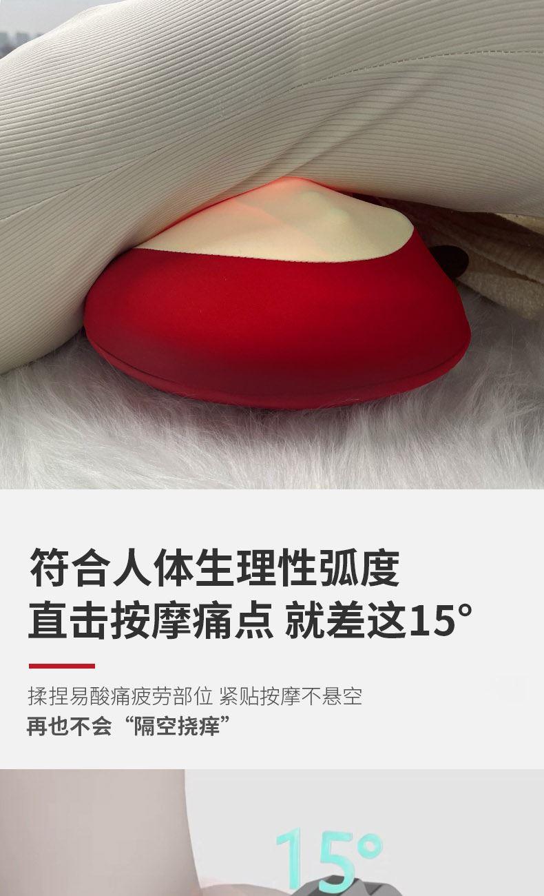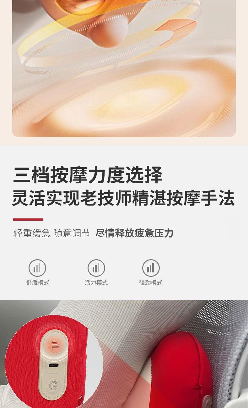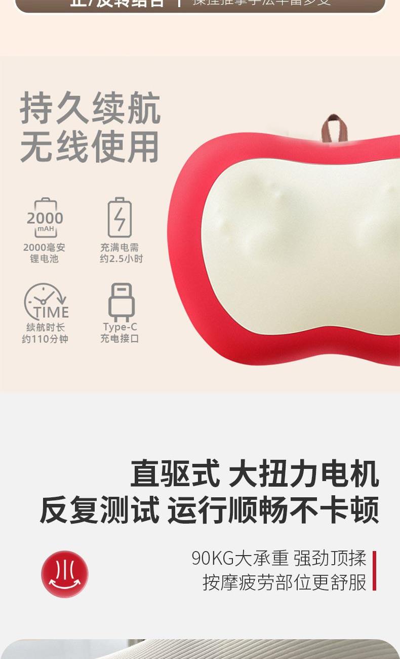 定輸入:5V/2A 電池容量:1800毫安 力度擋位:3檔 適用部位:頸/腰/背/腹/腿/臀 顏色:紅色 藍色 綠色 產(chǎn)品凈重:約1.45KG 充電時間:約3小時 材質(zhì):記憶棉+高彈手感布 產(chǎn)品尺寸:345X281 X122MM 按摩體驗類(直擊痛點,模擬專業(yè)手感):15° 機芯傾斜設計,貼合人體生理弧度,直擊按摩痛點,正轉(zhuǎn)按壓 + 反轉(zhuǎn)揉捏,搭配三檔力度,復刻老技師推拿手法,43° 紅光溫感熱敷,深層舒緩酸痛疲勞,加速血液循環(huán),全身多部位適配:腰 / 頸 / 肩 / 背 / 腿,一臺滿足全家需求,90KG 大承重,強勁頂揉不塌陷,按摩更到位