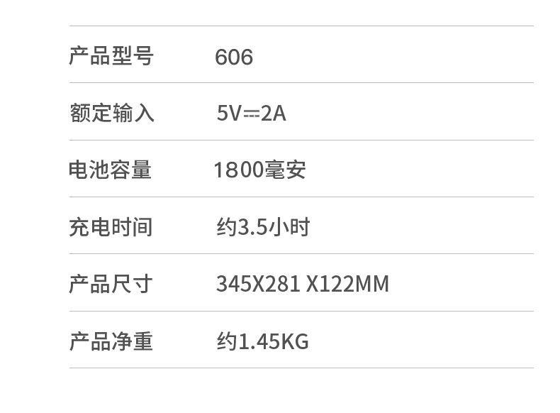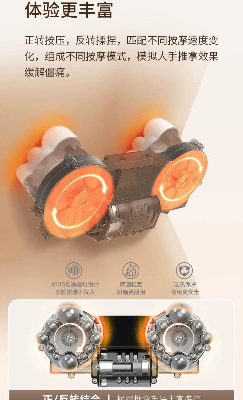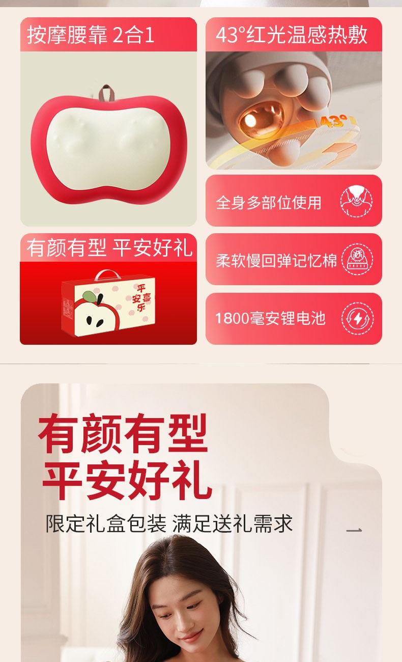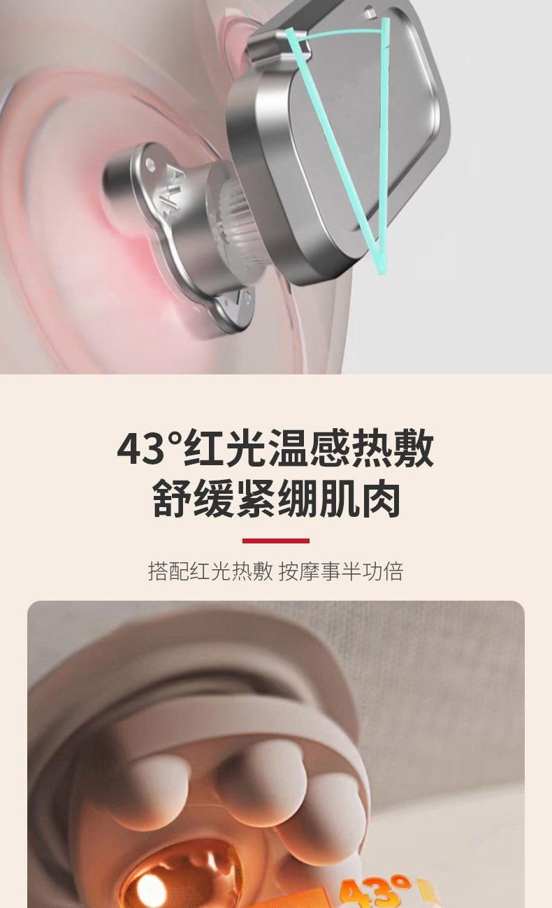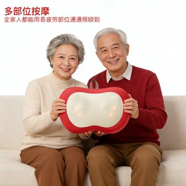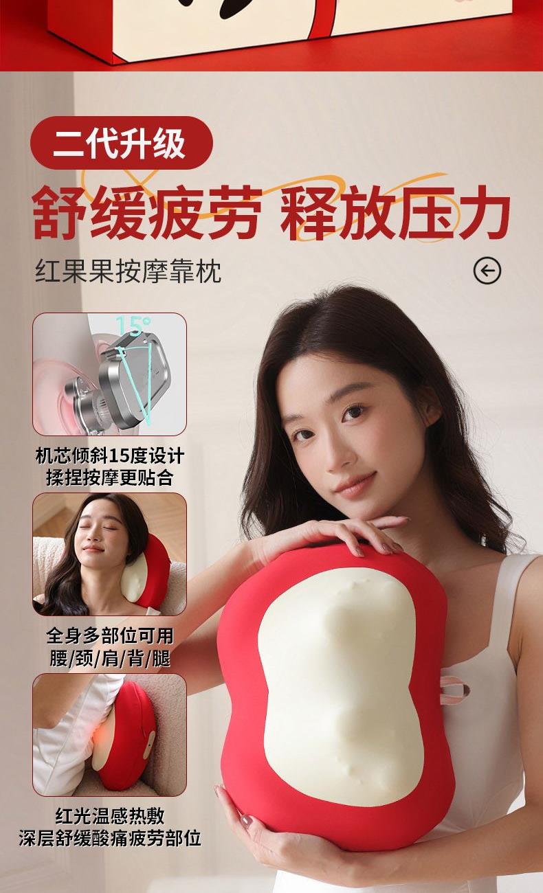 定輸入:5V/2A 電池容量:1800毫安 力度擋位:3檔 適用部位:頸/腰/背/腹/腿/臀 顏色:紅色 藍色 綠色 產(chǎn)品凈重:約1.45KG 充電時間:約3小時 材質(zhì):記憶棉+高彈手感布 產(chǎn)品尺寸:345X281 X122MM 按摩體驗類(直擊痛點,模擬專業(yè)手感):15° 機芯傾斜設計,貼合人體生理弧度,直擊按摩痛點,正轉(zhuǎn)按壓 + 反轉(zhuǎn)揉捏,搭配三檔力度,復刻老技師推拿手法,43° 紅光溫感熱敷,深層舒緩酸痛疲勞,加速血液循環(huán),全身多部位適配:腰 / 頸 / 肩 / 背 / 腿,一臺滿足全家需求,90KG 大承重,強勁頂揉不塌陷,按摩更到位