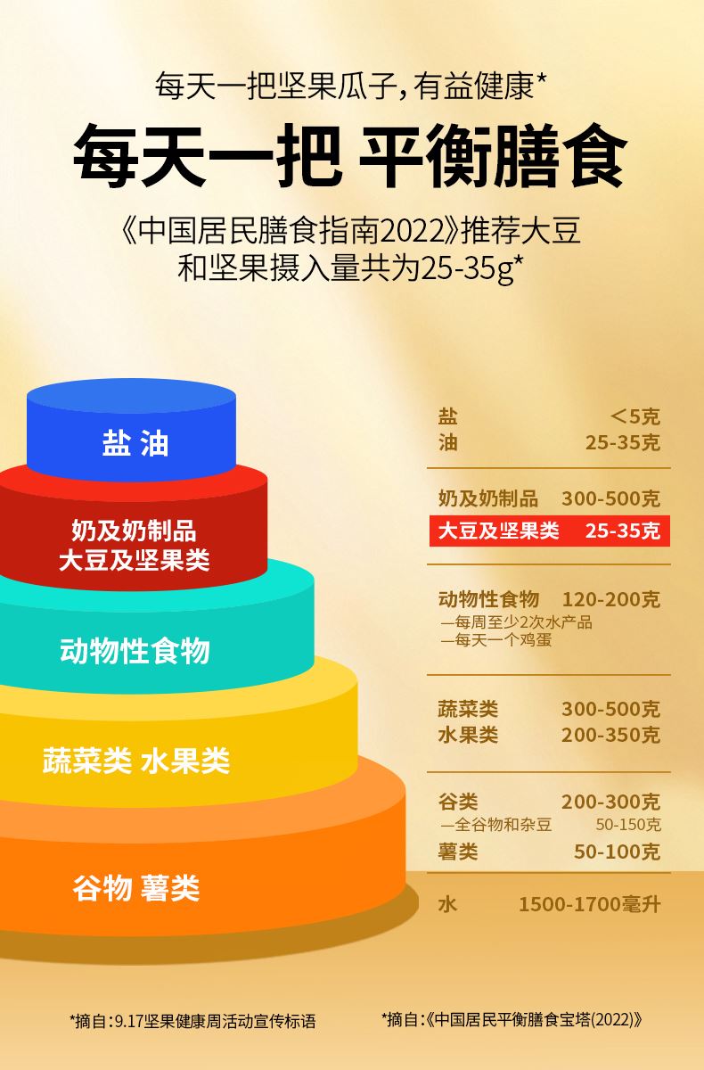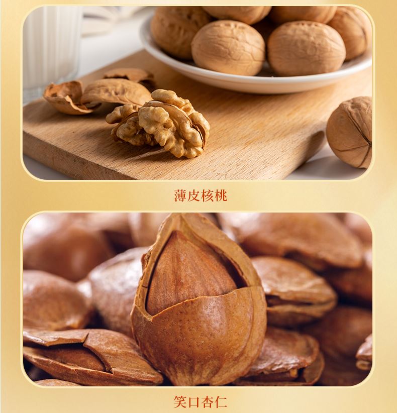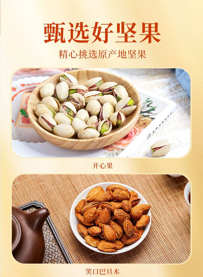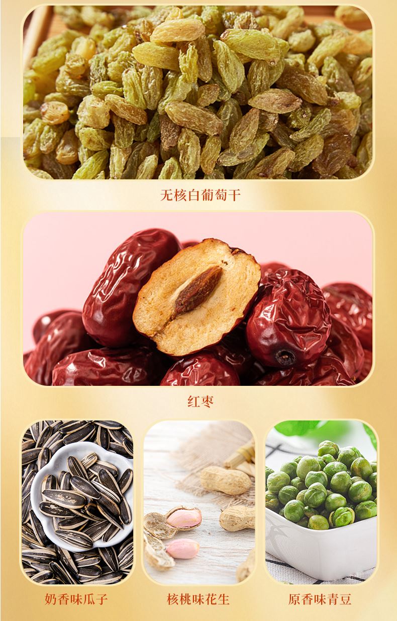 禮盒配置: 60克開心果*1袋 70克笑口巴旦木*1袋 88克薄皮核桃*1袋 76克笑口杏仁*1袋 108克無核白葡萄干*1袋 88克紅棗*2袋 88克奶香味瓜子*2袋 88克核桃味花生*1袋 88克原香味青豆*2袋