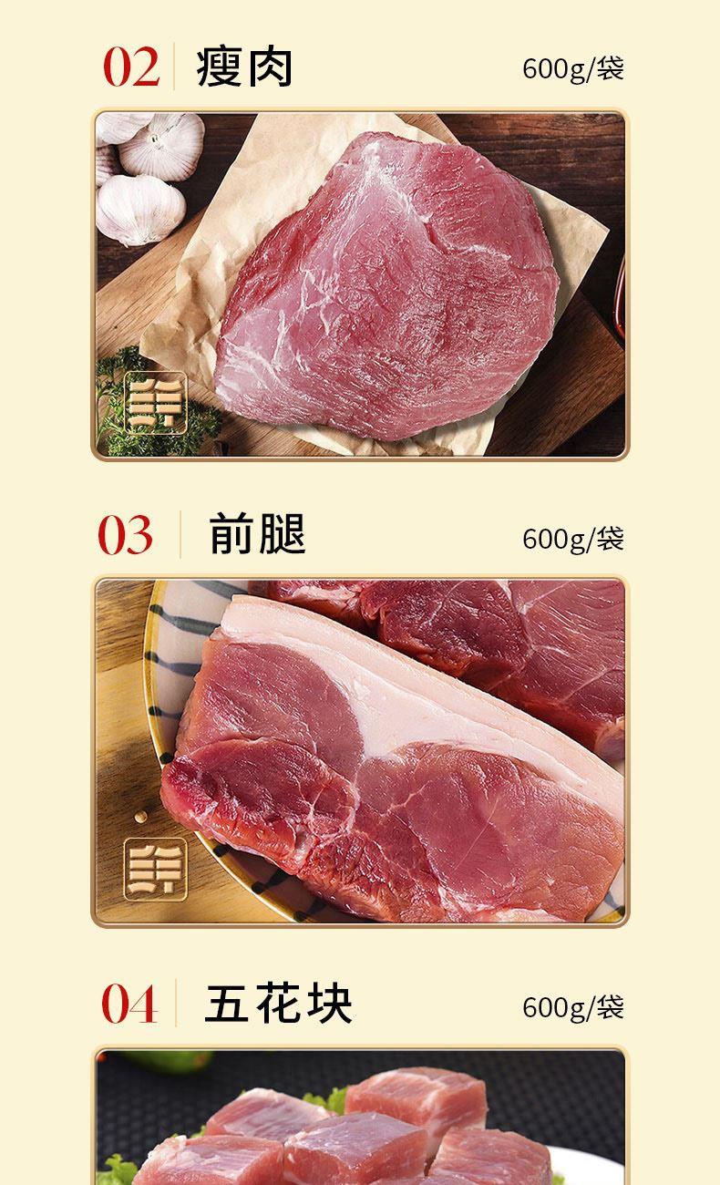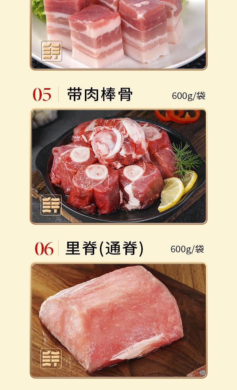 冰鮮黑豬前腿 600g*1袋 冰鮮黑豬瘦肉 600g*1袋 冰鮮黑豬五花塊 600g*1袋 冰鮮黑豬肋排塊 600g*1袋 冰鮮黑豬帶肉棒骨 600g*1袋 冰鮮黑豬里脊(通脊) 600g*1袋