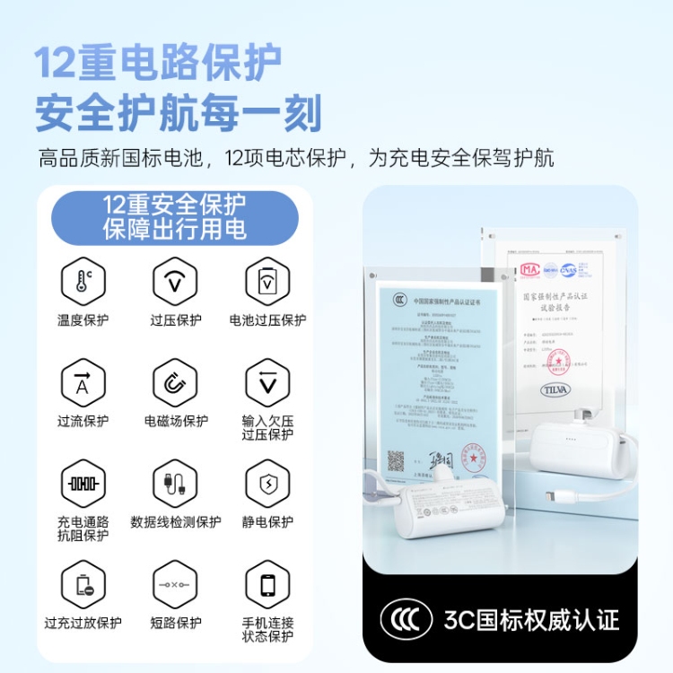 電池容量:5000mAh 產品尺寸:79*49*26mm 包裝尺寸:170*100*32mm 產品重量:90g 輸入type-C口:5V/2A  輸出type-C口/type-c頭:5V/2A 輸出Lightning線: 5V2A 充電時間:4~6H 顏色:白色 材質:ABS+PC(防火) 口紅大小,即插即用,多設備兼容, 兩種接口,插上就來電,小體積大容量, 90g輕盈便攜,是充電線也是掛繩, 邊充邊玩,智能全兼容不同設備, 可上飛機,智能芯片,低溫快充