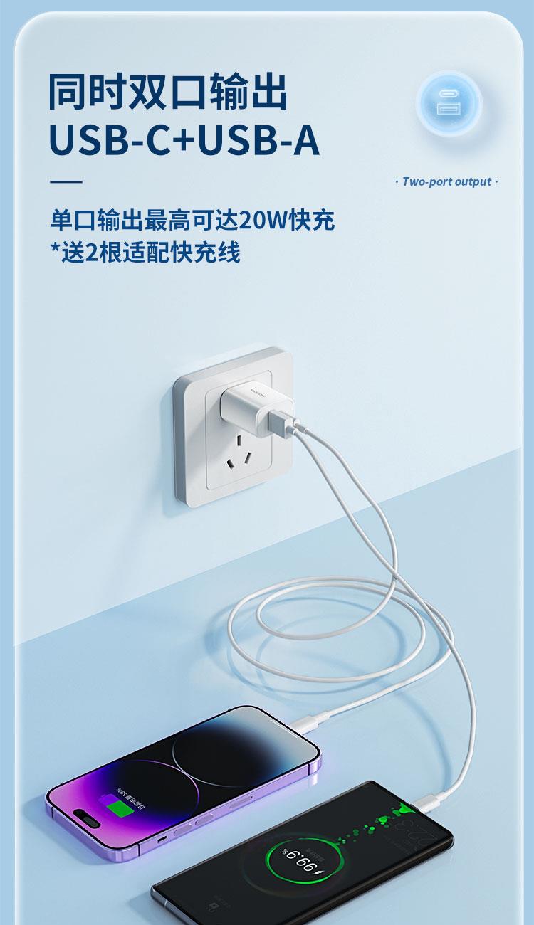 產品尺寸:41.8*26.1.1*58.60mm 包裝尺寸:90*45*140mm 產品重量:44.7g 輸入:100-240V~50/60Hz 輸出USB-C:5V 3A,9V 2.22A,12V 1.67A 20Wmax 輸出USB-A:5V 3A,9V 2A,12V 1.5A 18WMax 顏色:白 材質:ABS+PC 配PD線+20W A TO C全兼容線安全大功率PD快充,低溫快充不易燙 智能涓流,保護電池健康,小巧便攜, 多設備兼容,多重保護